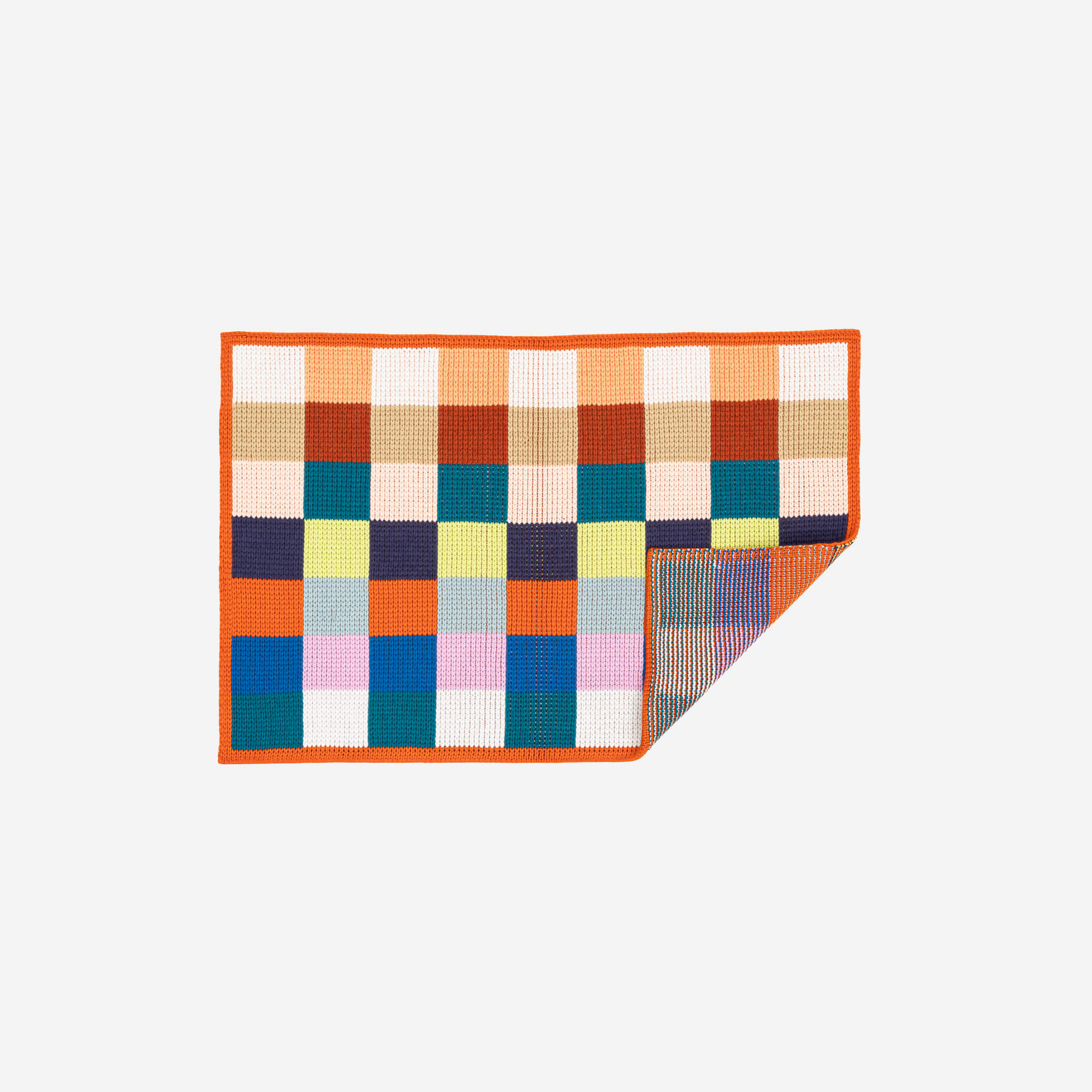 Knit mini rug with bright squares of color and a contrast border. Add a pop of color and pattern to your entryway, kitchen, bathroom, or bedside. Non-slip mat included. Washable.