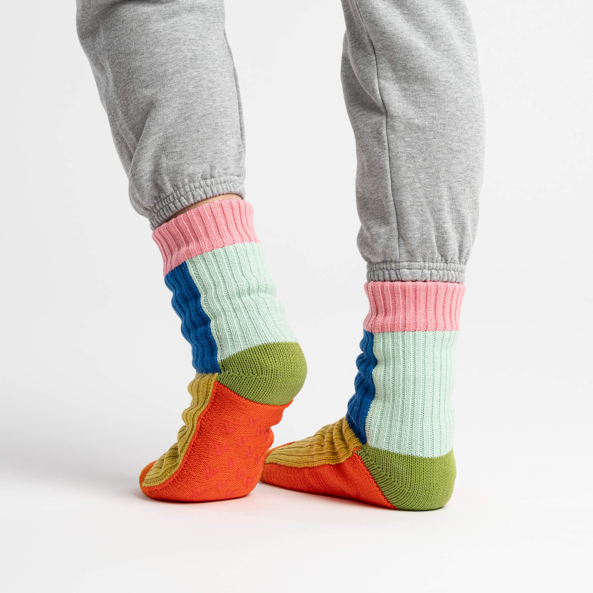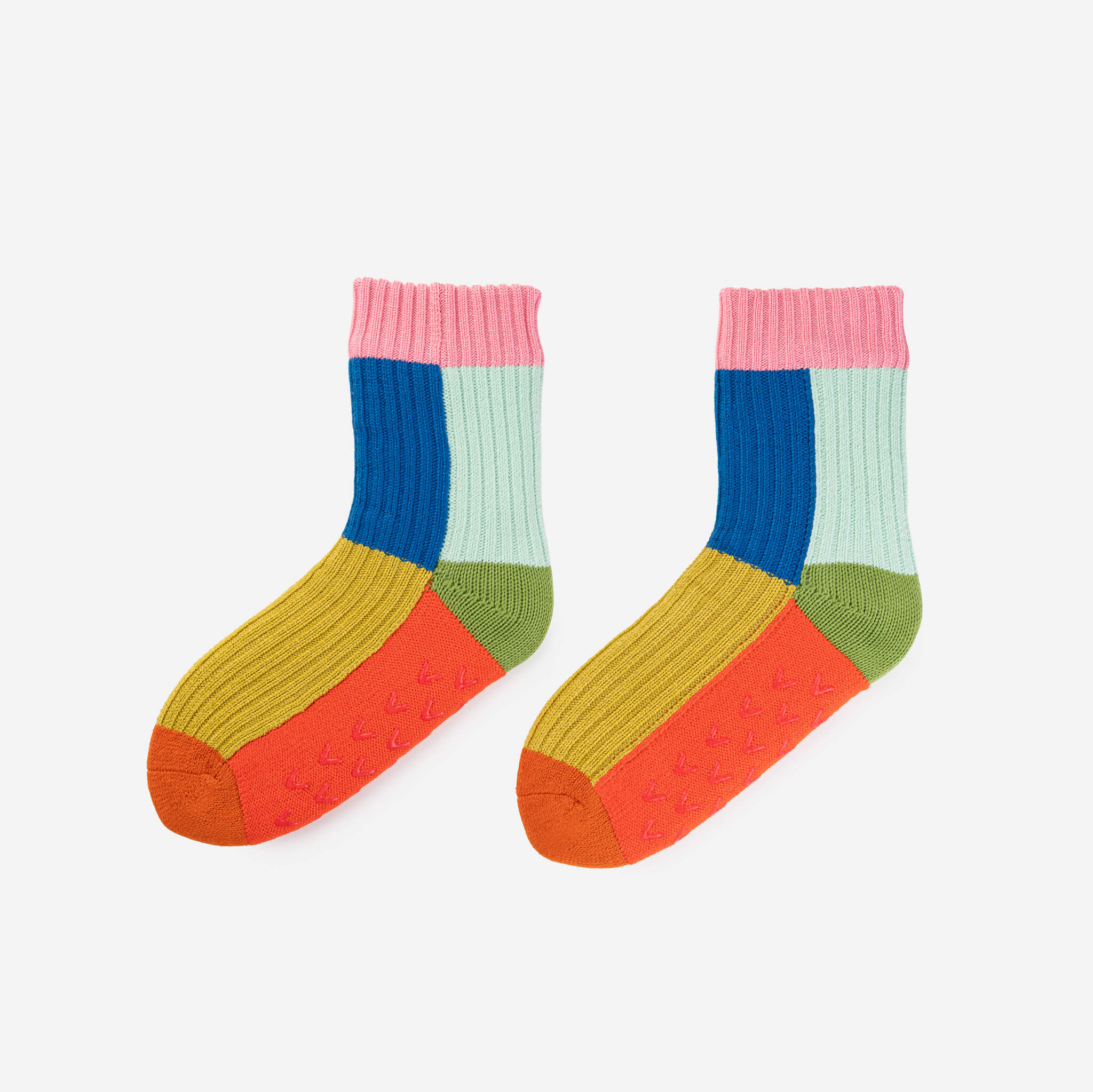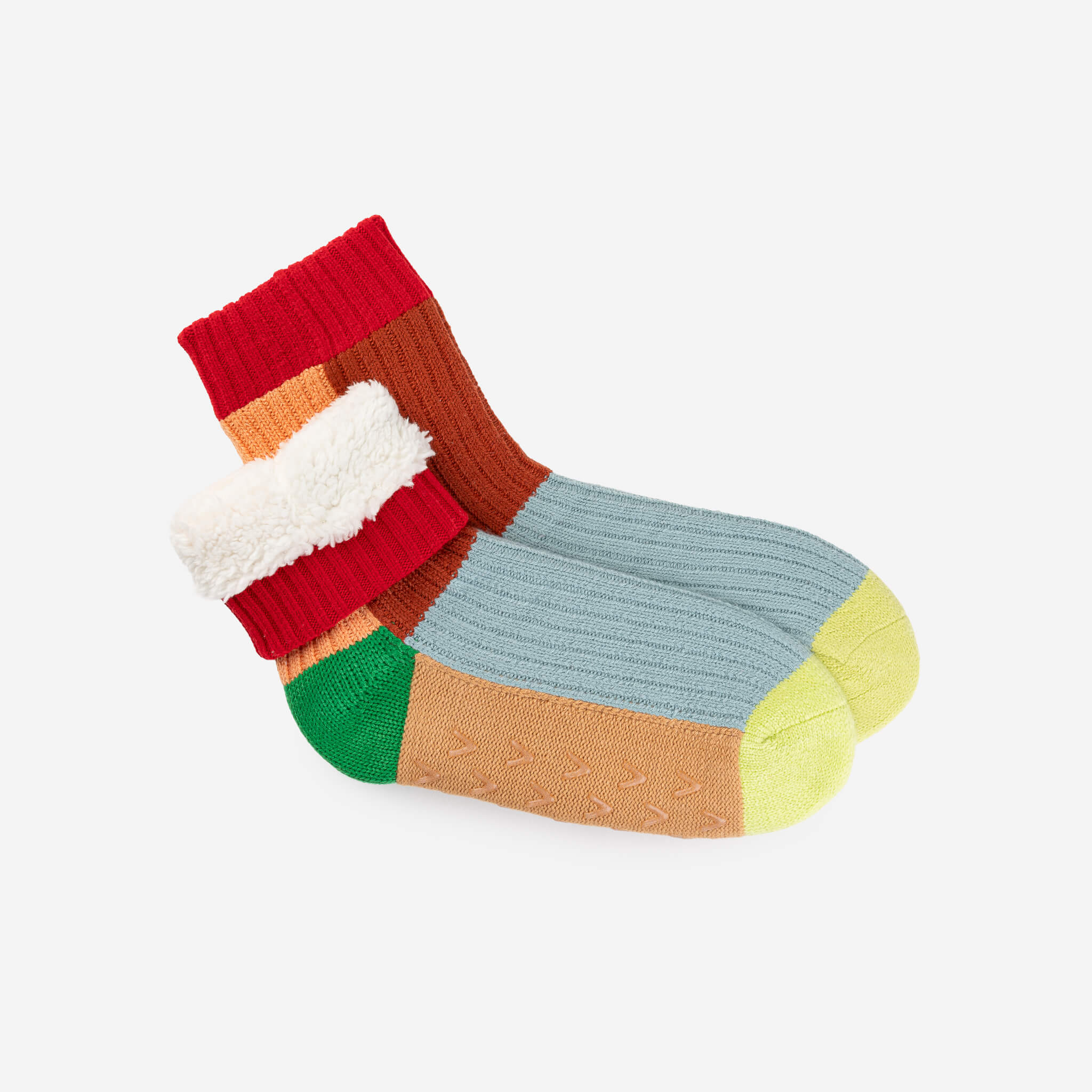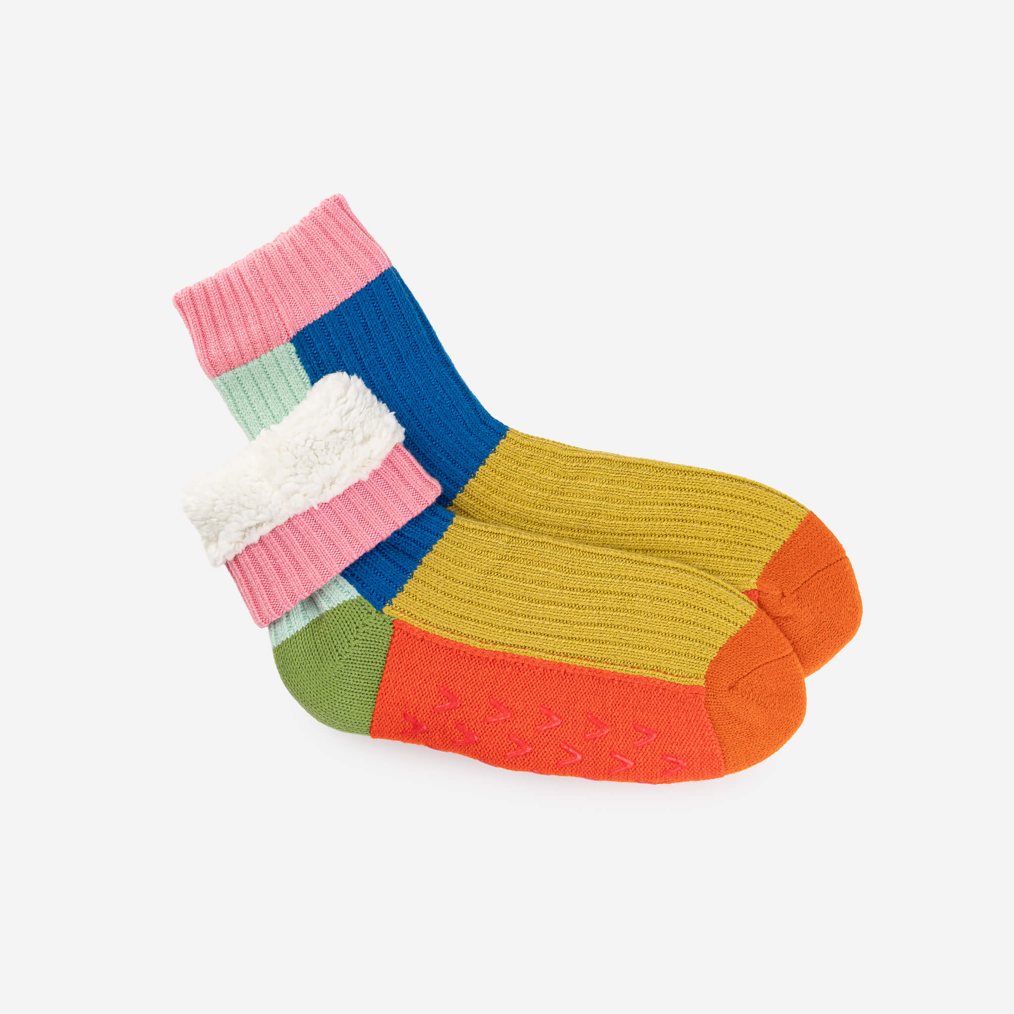 These unisex fleece-lined knit slipper socks are the best of both worlds! The easy fit of socks meets the plush comfort of house slippers. Bold and bright colorblocking will keep you cozy (and bright) indoors. Fully lined with fluffy faux fleece. Non-slip patches on sole. Machine washable.