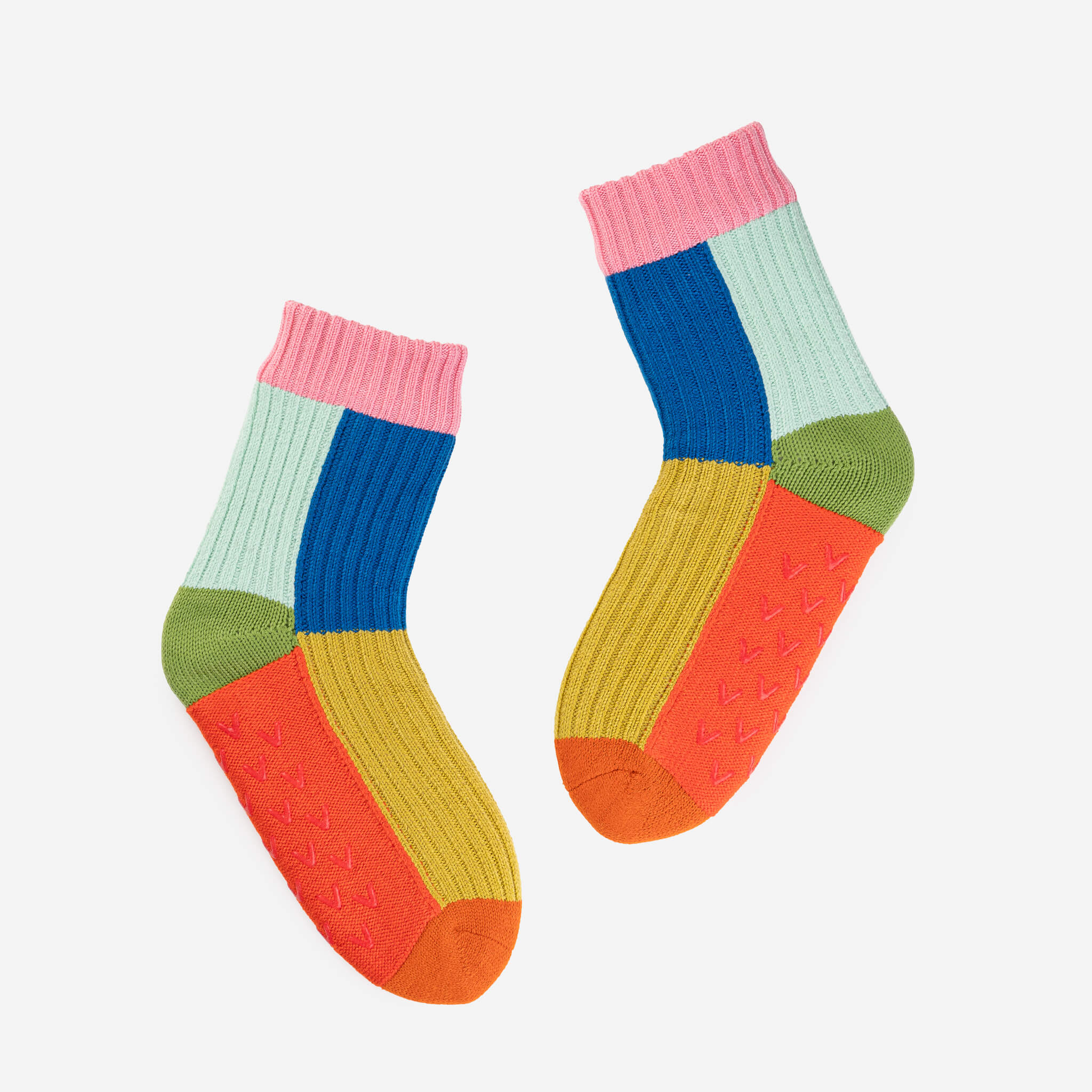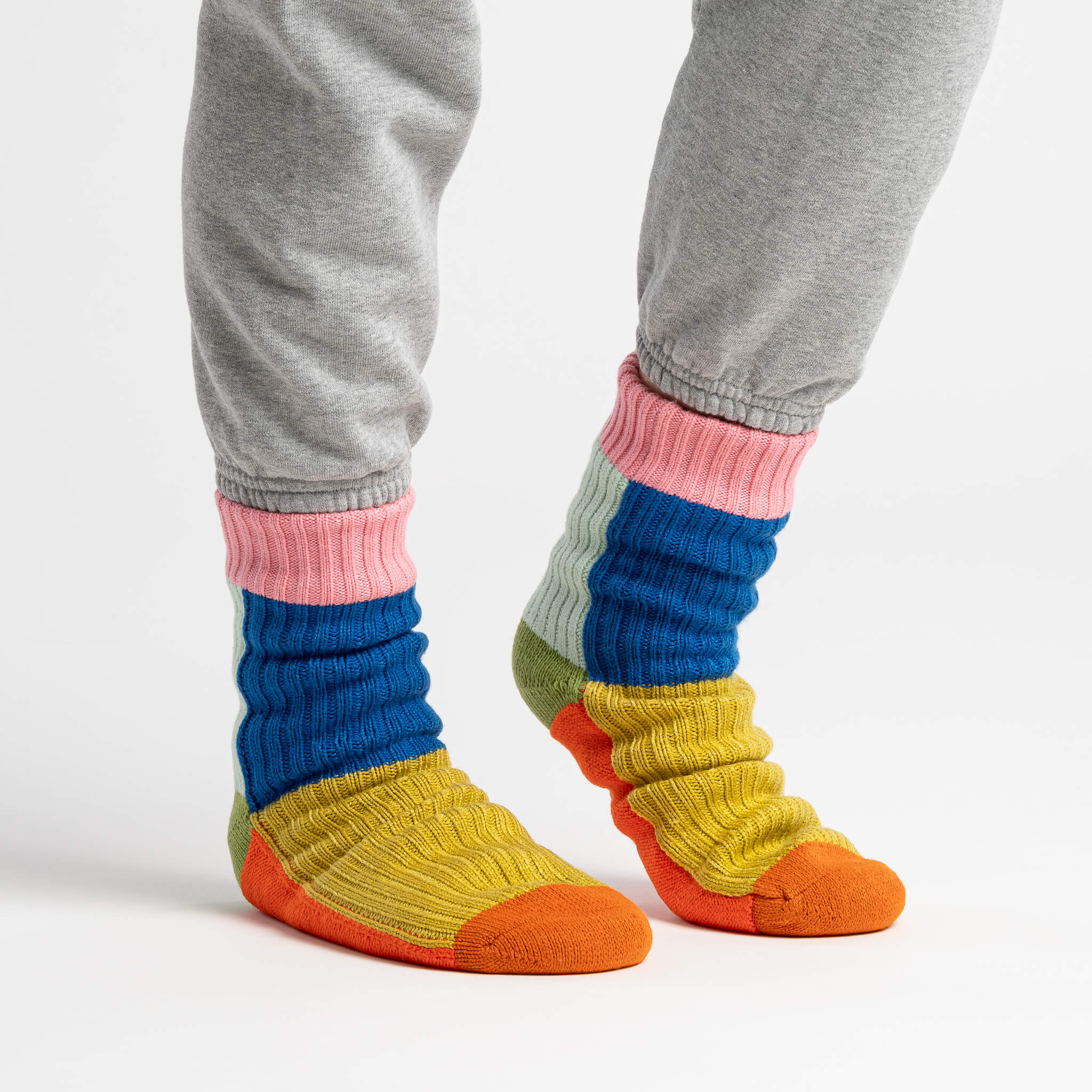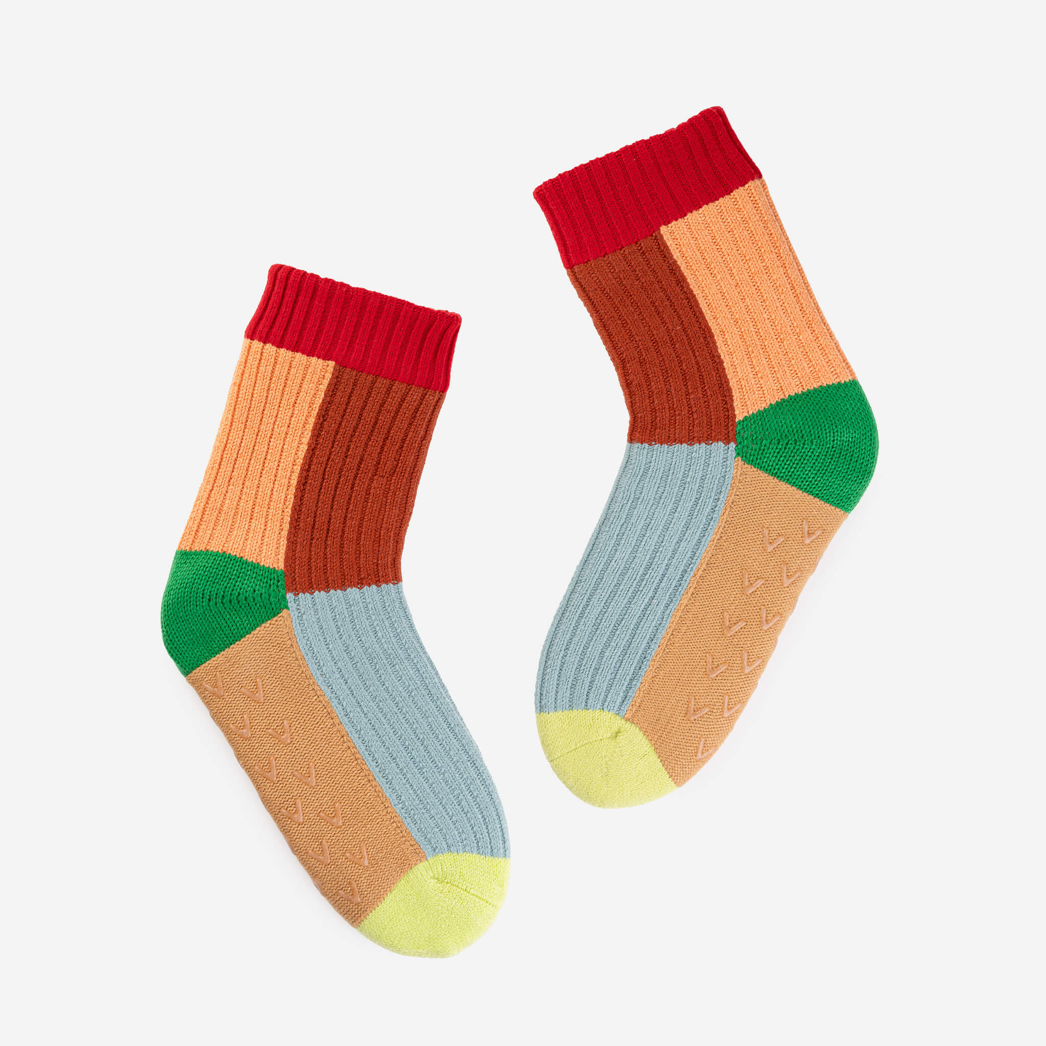 These unisex fleece-lined knit slipper socks are the best of both worlds! The easy fit of socks meets the plush comfort of house slippers. Bold and bright colorblocking will keep you cozy (and bright) indoors. Fully lined with fluffy faux fleece. Non-slip patches on sole. Machine washable.