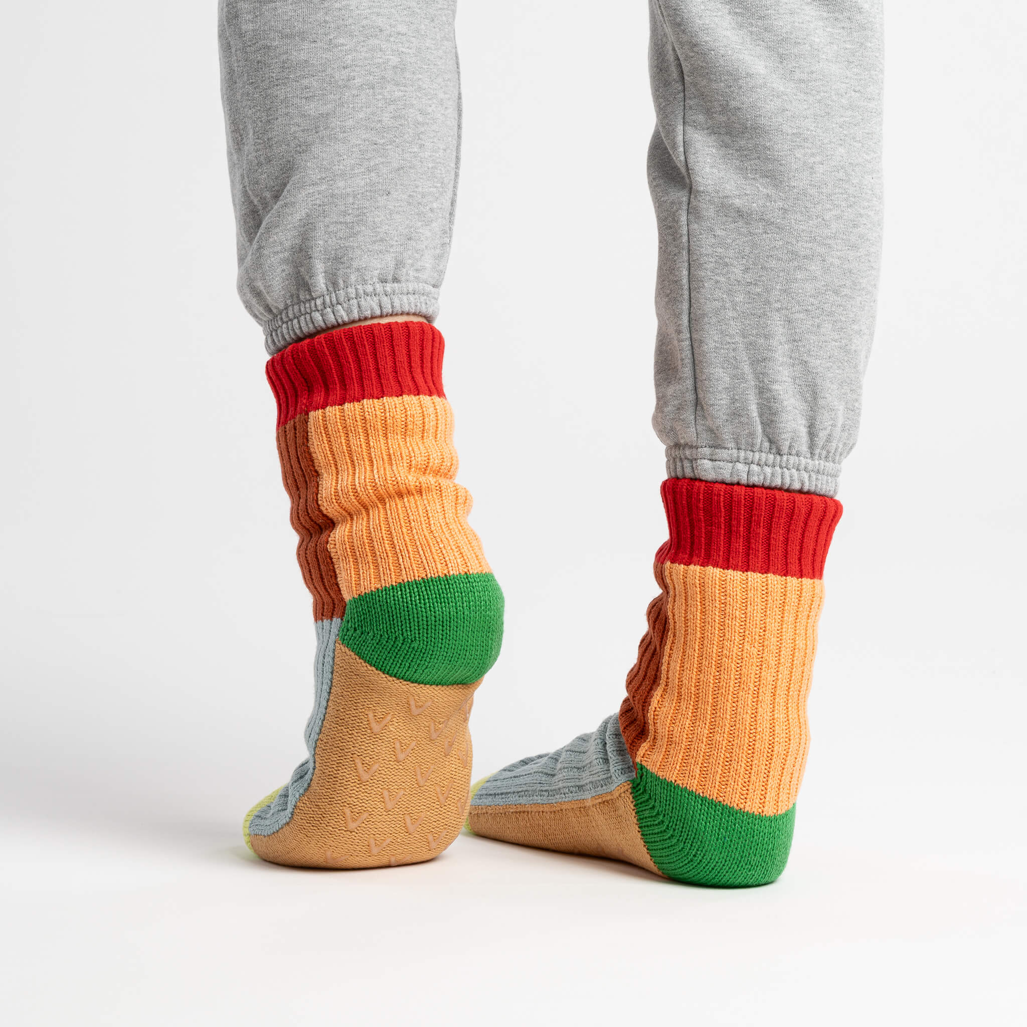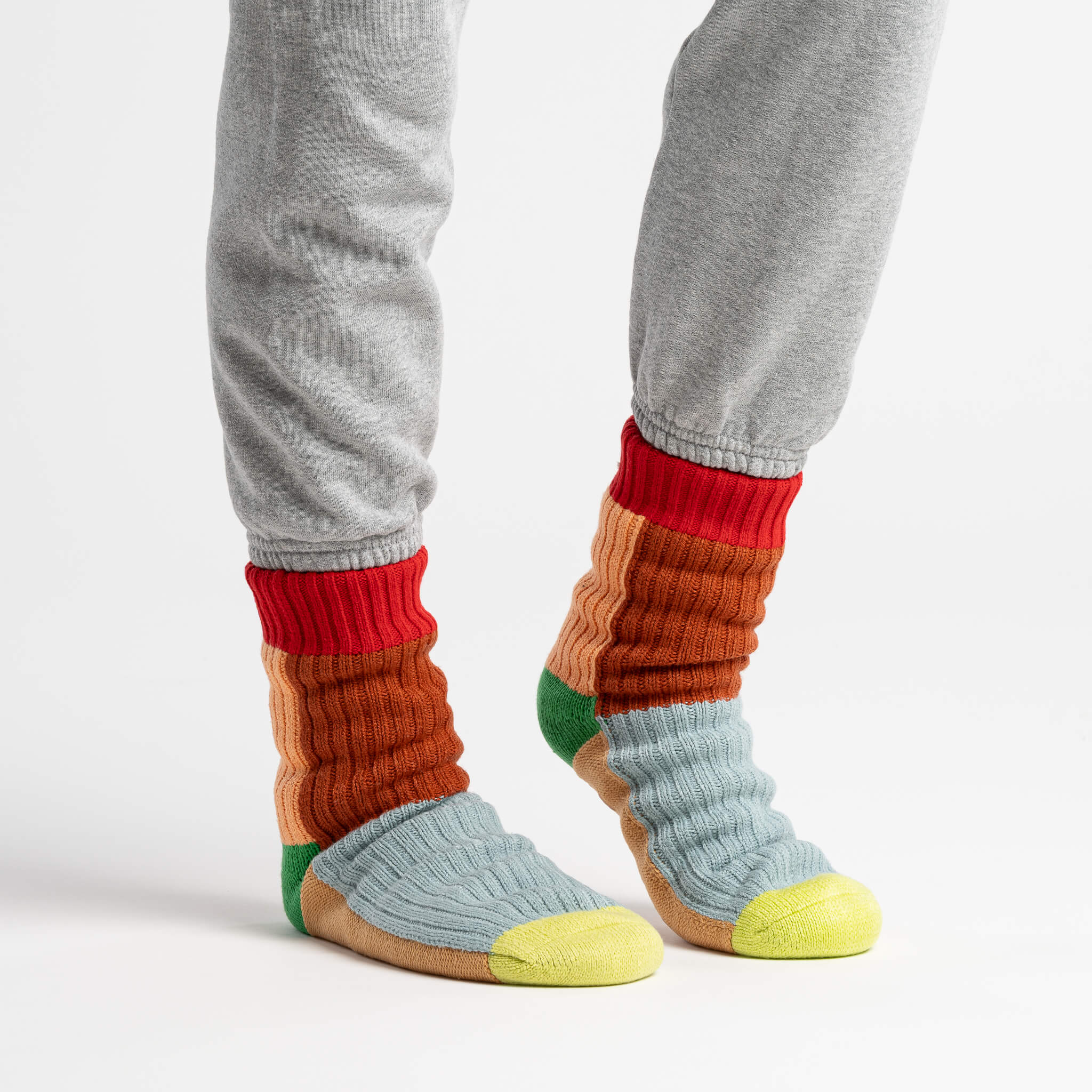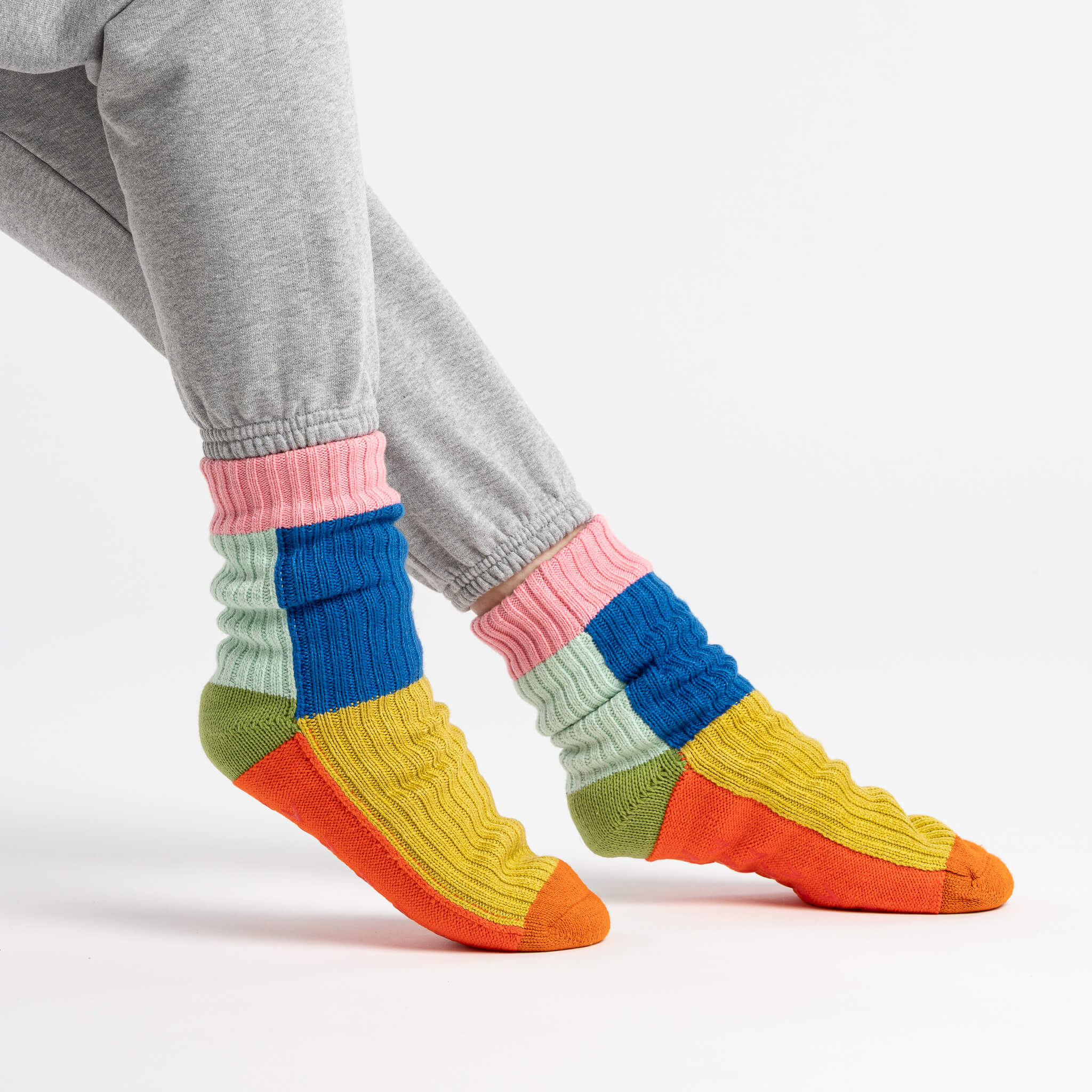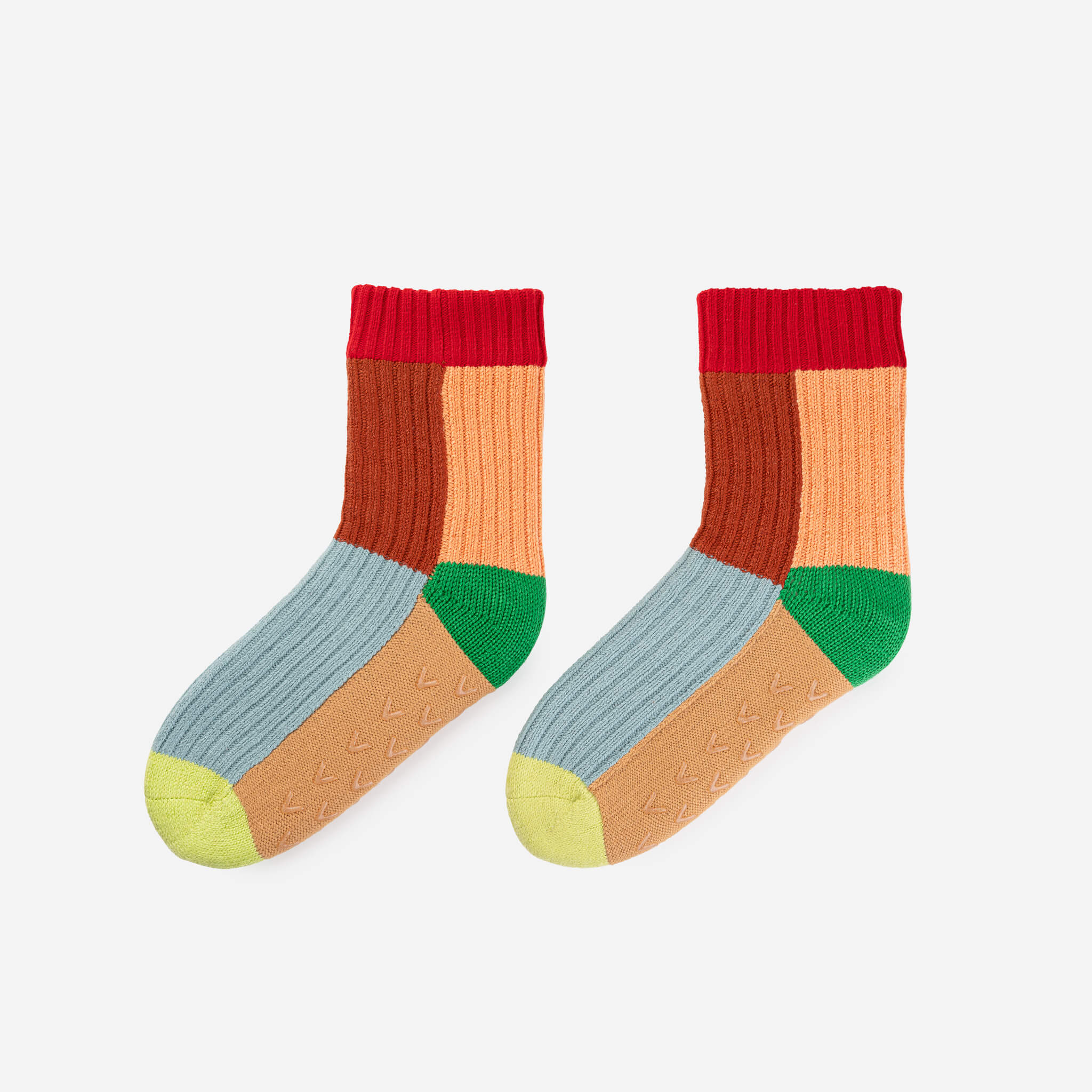 These unisex fleece-lined knit slipper socks are the best of both worlds! The easy fit of socks meets the plush comfort of house slippers. Bold and bright colorblocking will keep you cozy (and bright) indoors. Fully lined with fluffy faux fleece. Non-slip patches on sole. Machine washable.