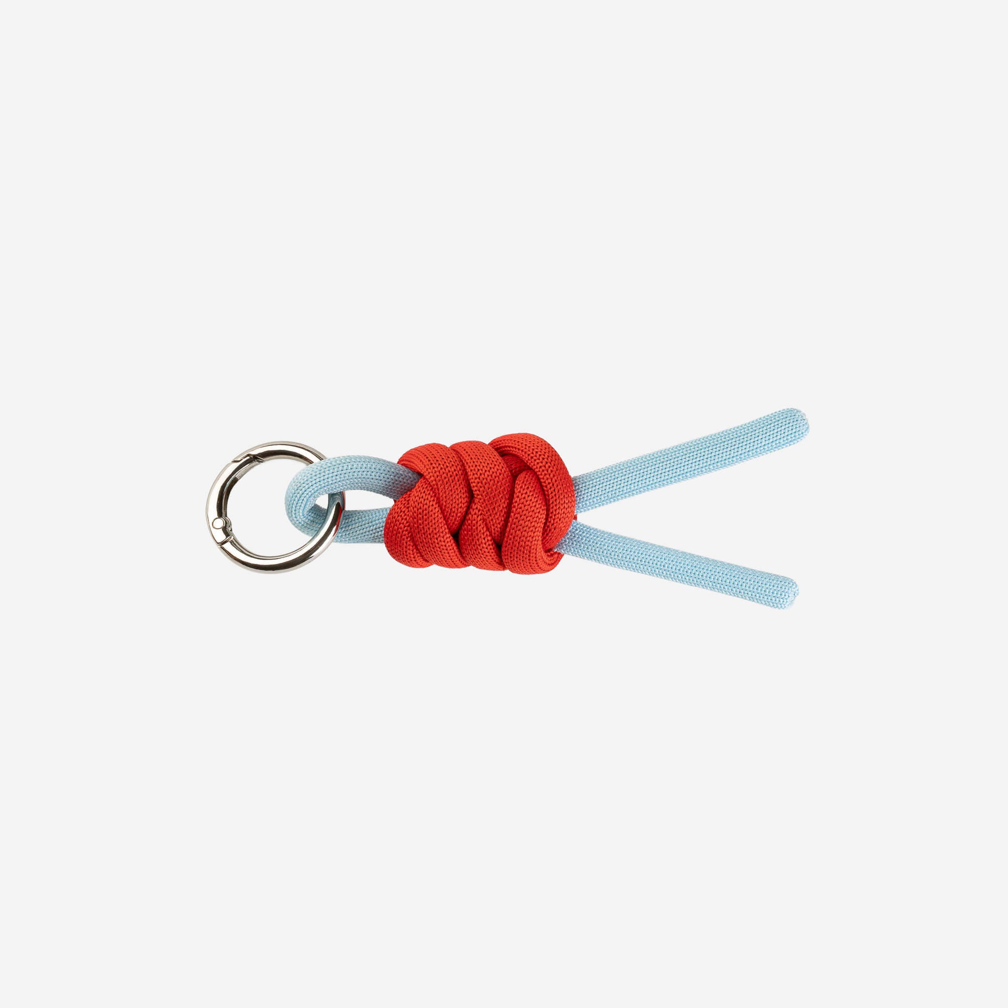 Crafted from sturdy, bright cord stuffed with deadstock and waste yarn, this knotted two-tone keychain is a fun addition to your keys, bag, or pouch. Finished with a round carabiner.