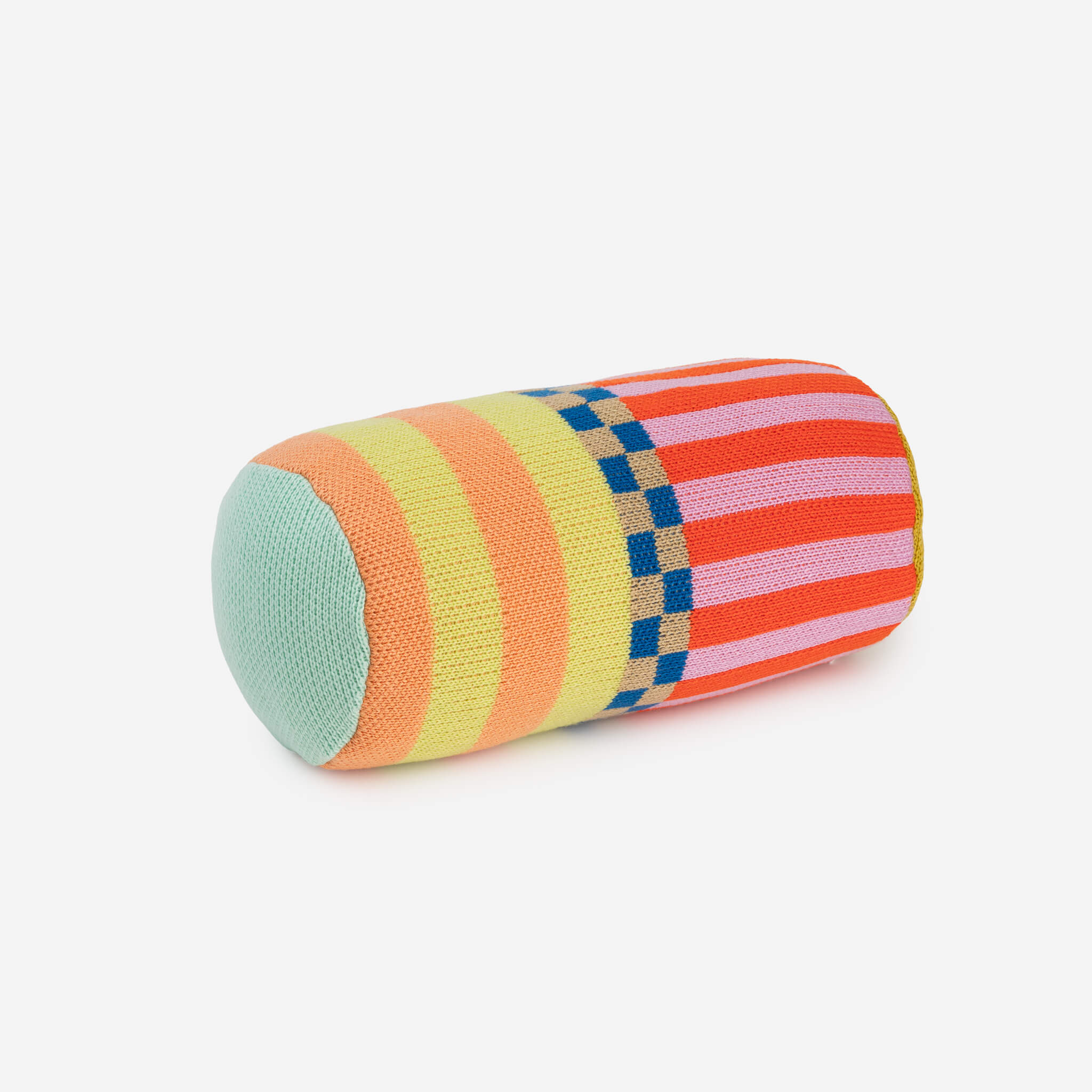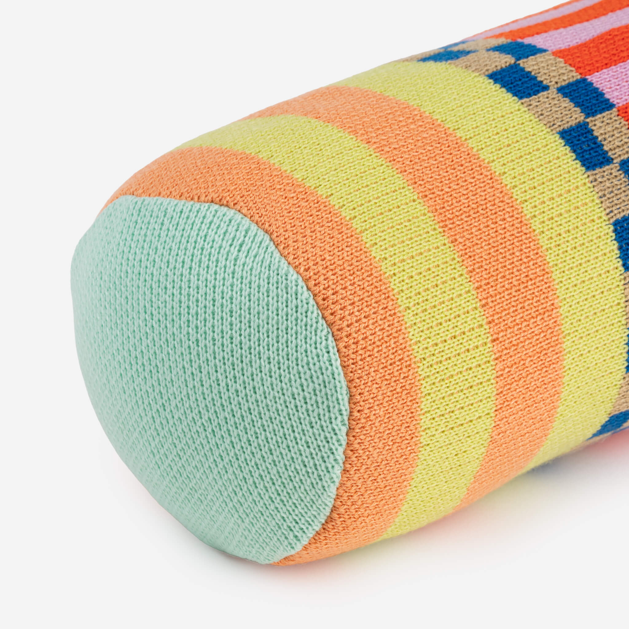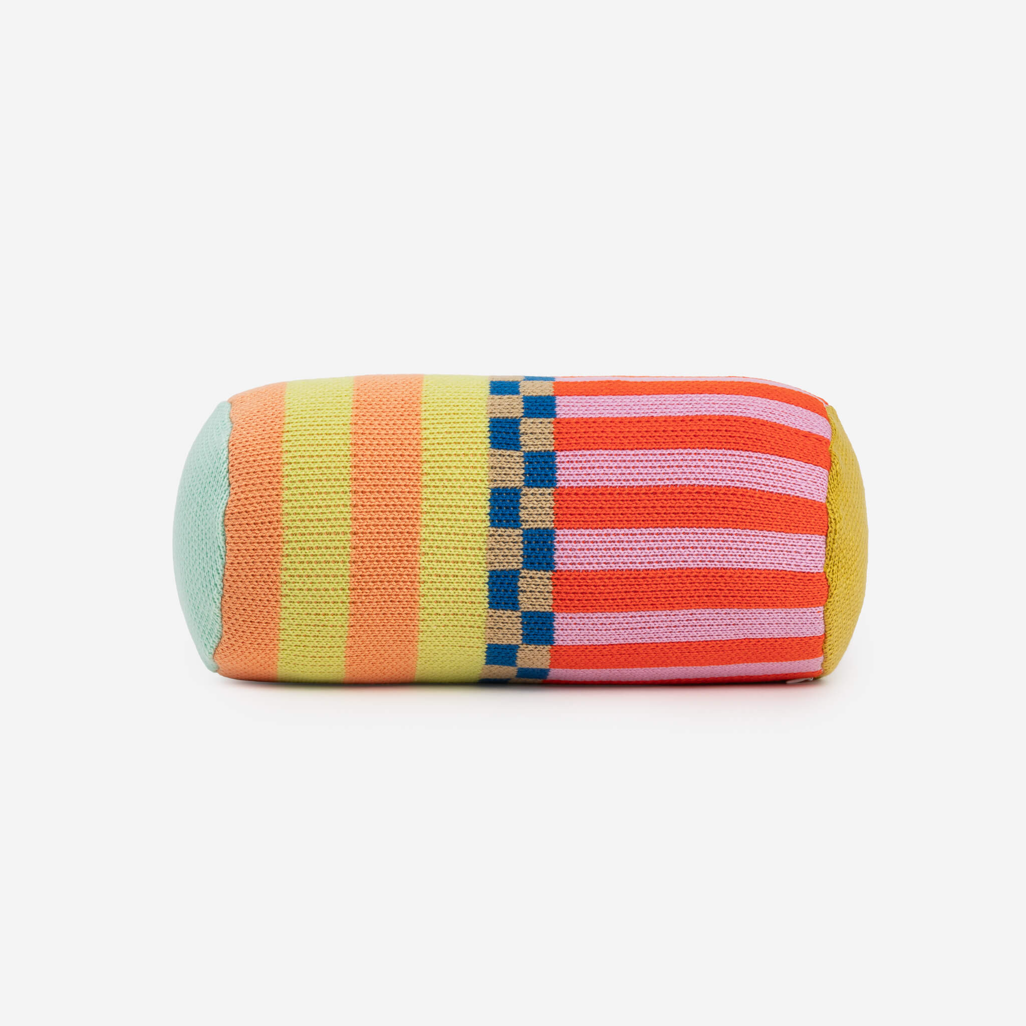 Plush bolster pillow with mix-and-match blocks of bold pattern. Mix and match with contrasting patterns or layer with a coordinating throw and pillow for a high-impact look. Pillow insert included. Knit with new and repurposed deadstock yarn.