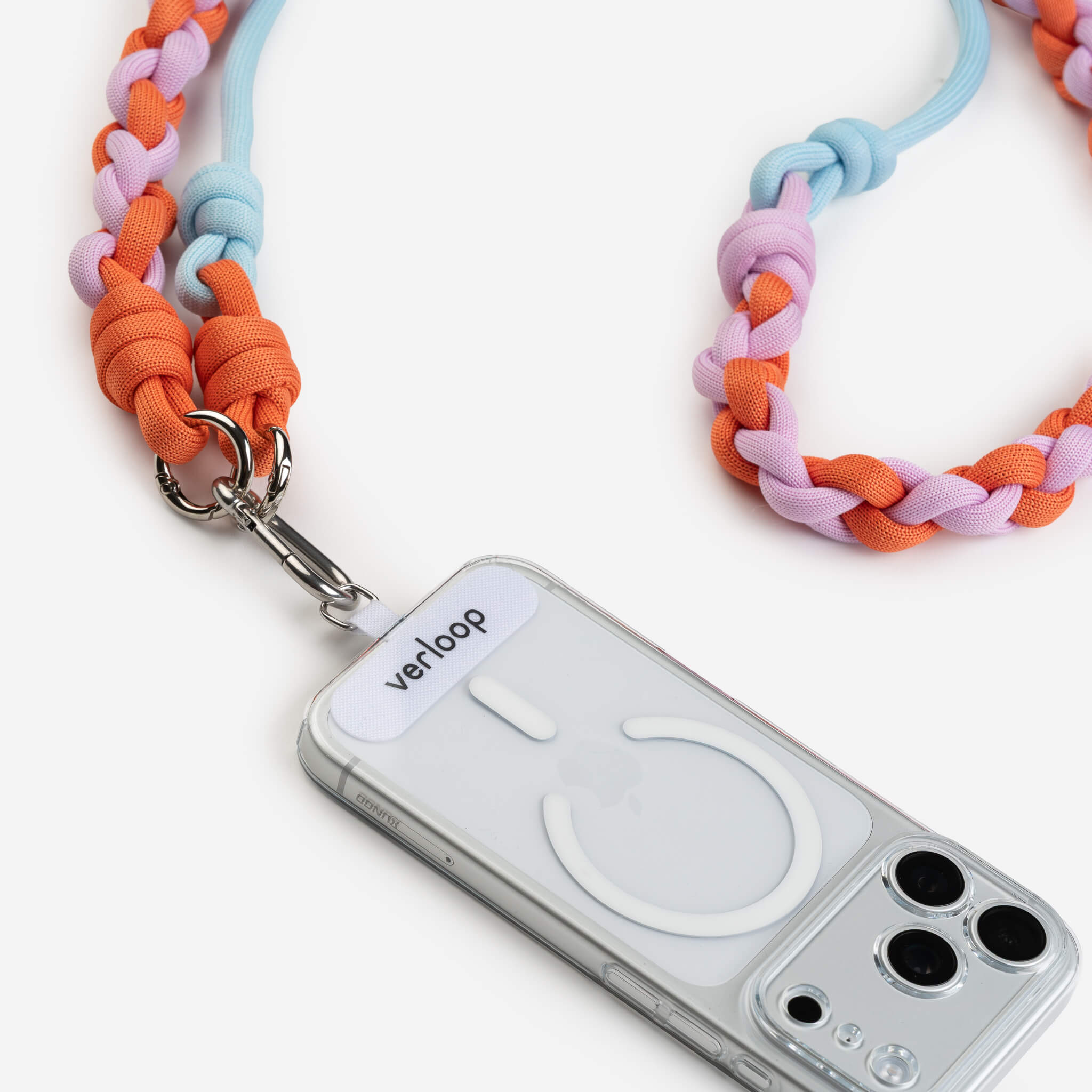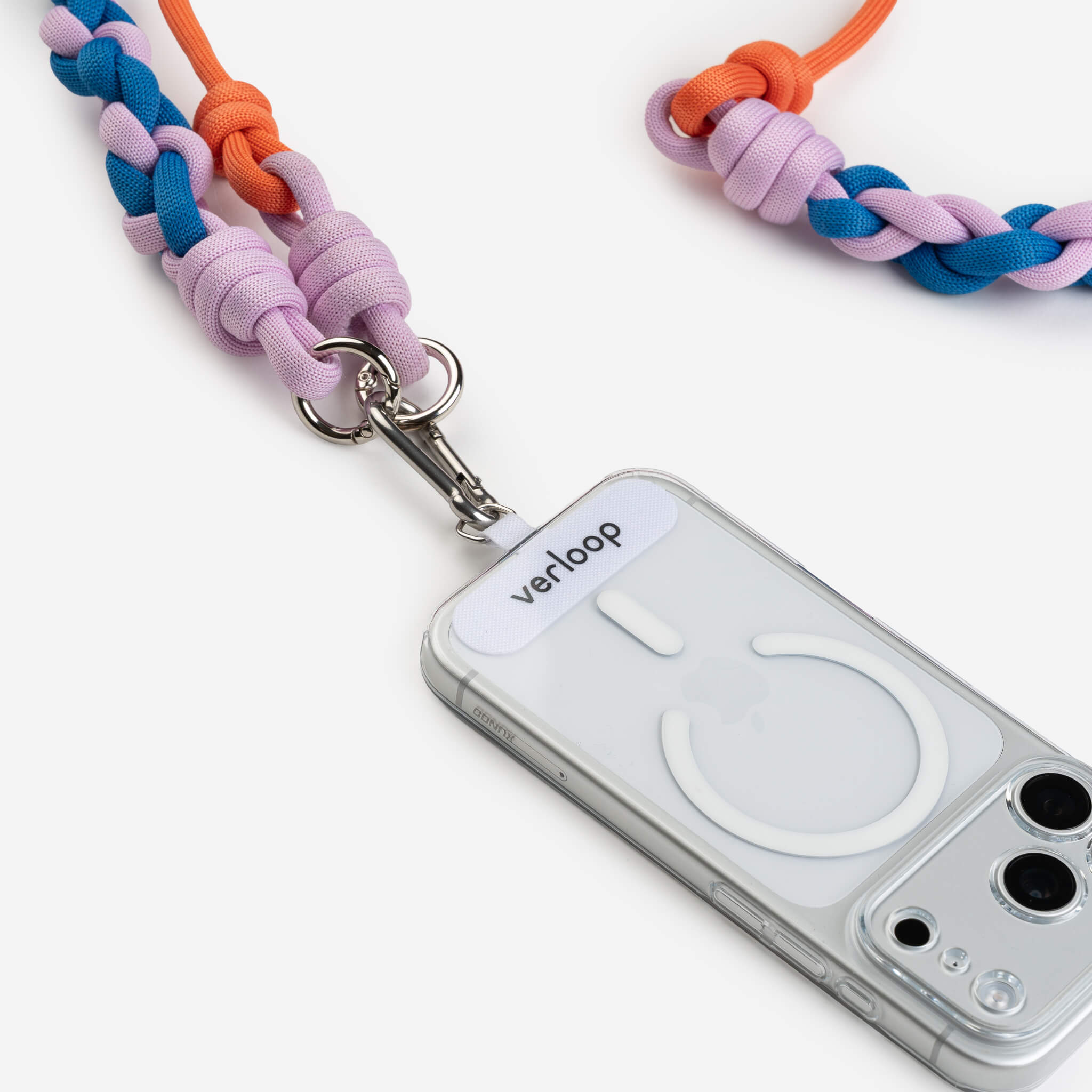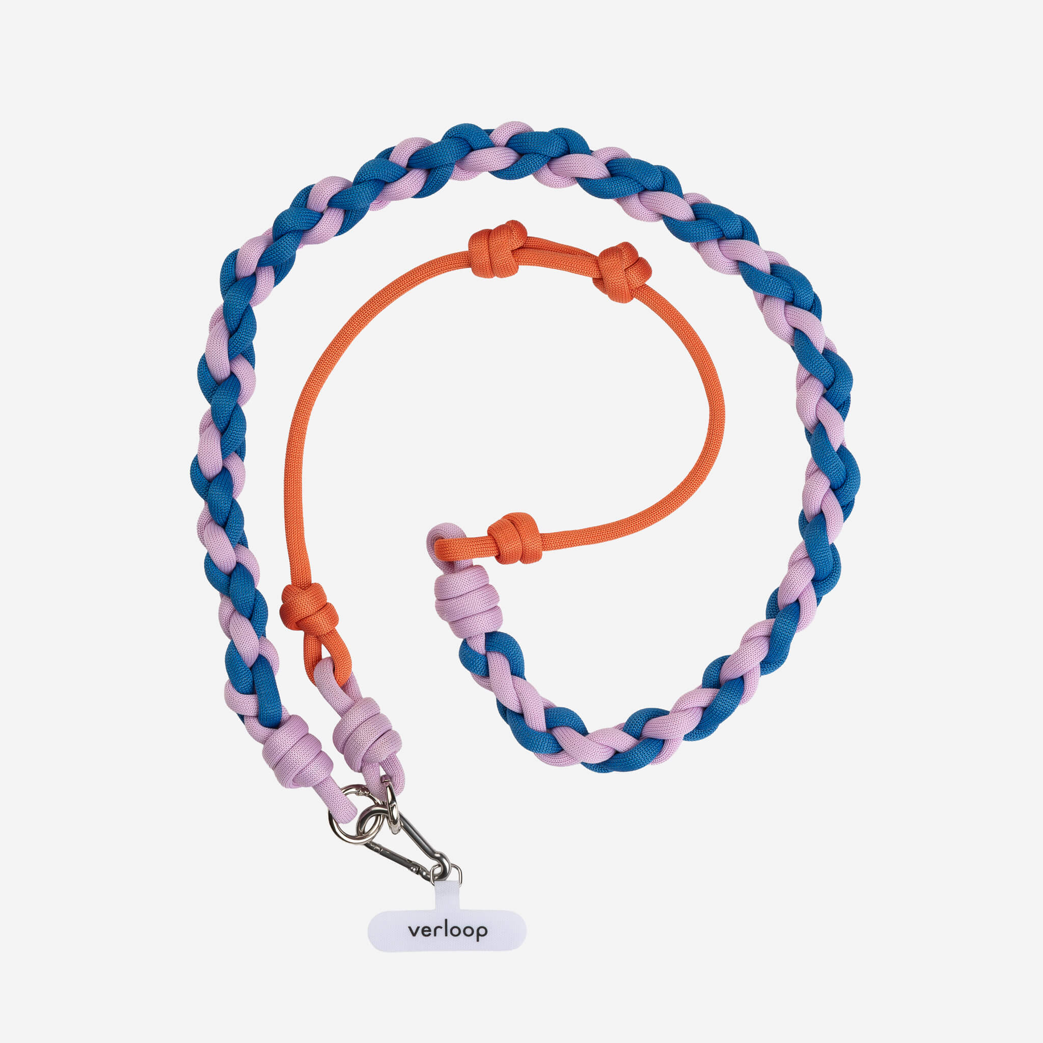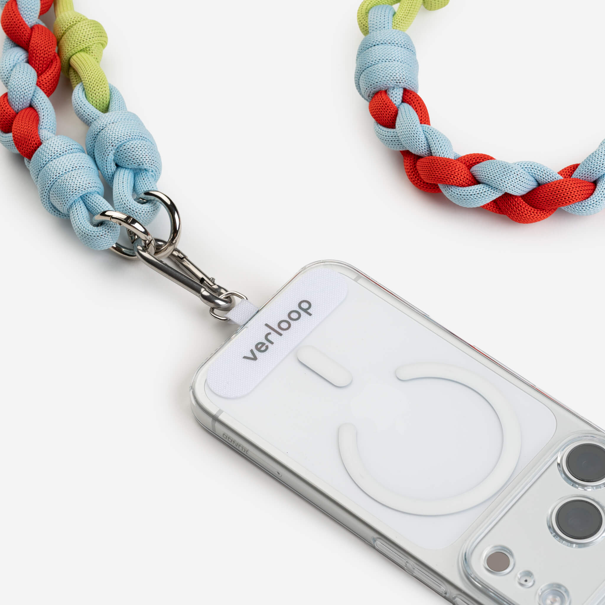 Colorblocked, adjustable phone strap for easy, hands-free wear. Slip the tether tab into your phone case and slide the knots to adjust length. Can be worn as a crossbody or lanyard. Crafted from sturdy, bright cord stuffed with deadstock and waste yarn. Finished with round carabiners and a sturdy branded tether tab.